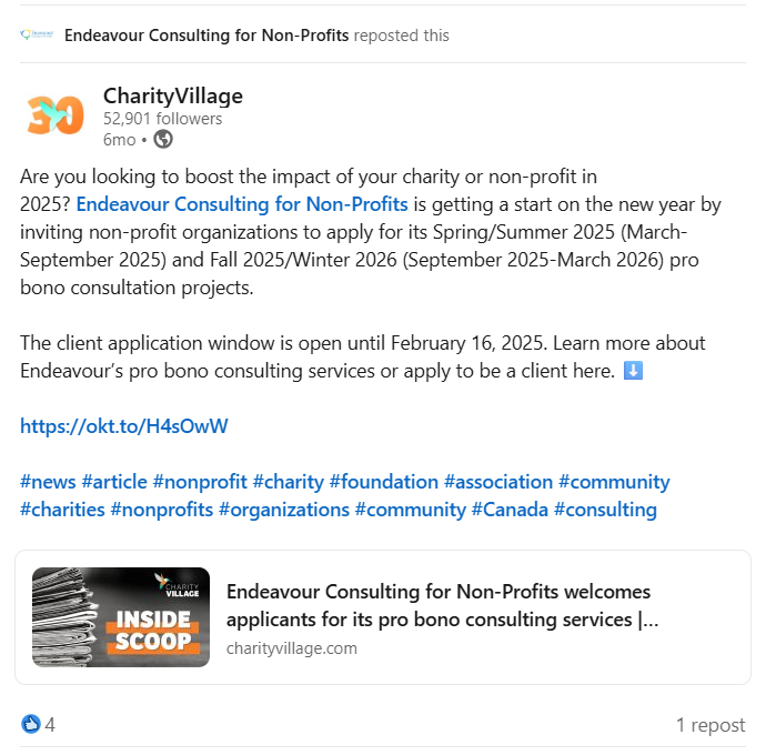 Charity Village boosted our reach by sharing a link to our press release on their social media channels.