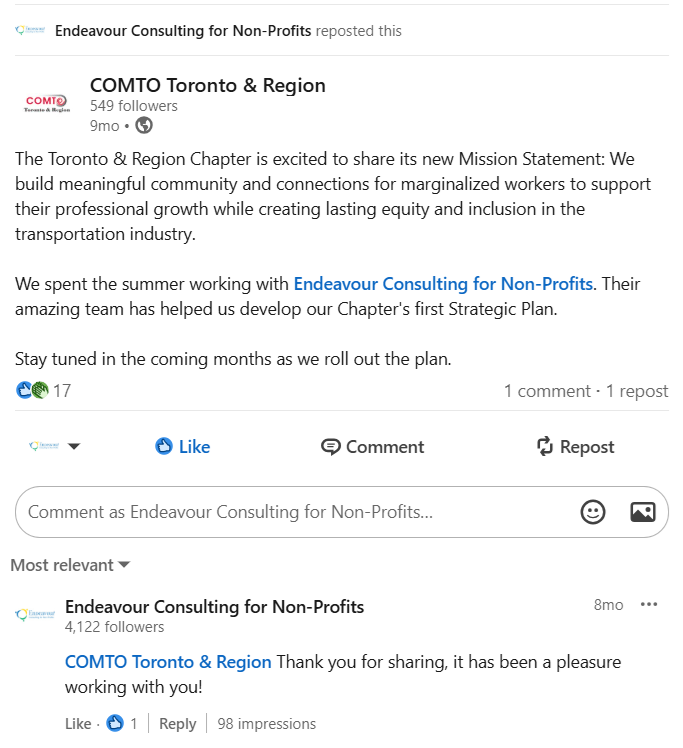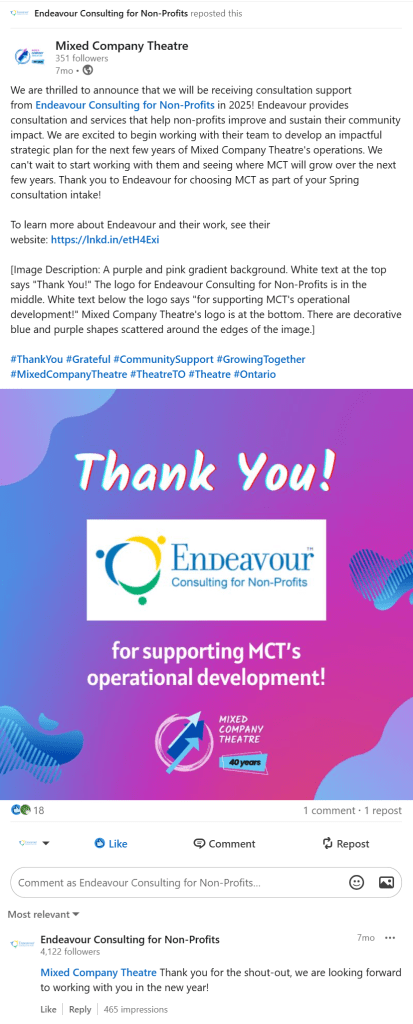 We also encouraged clients to post testimonials on their own channels about their experience working with Endeavour, such as the examples from the Conference of Minority Transportation Officials (COMTO) and Mixed Company Theatre below.
