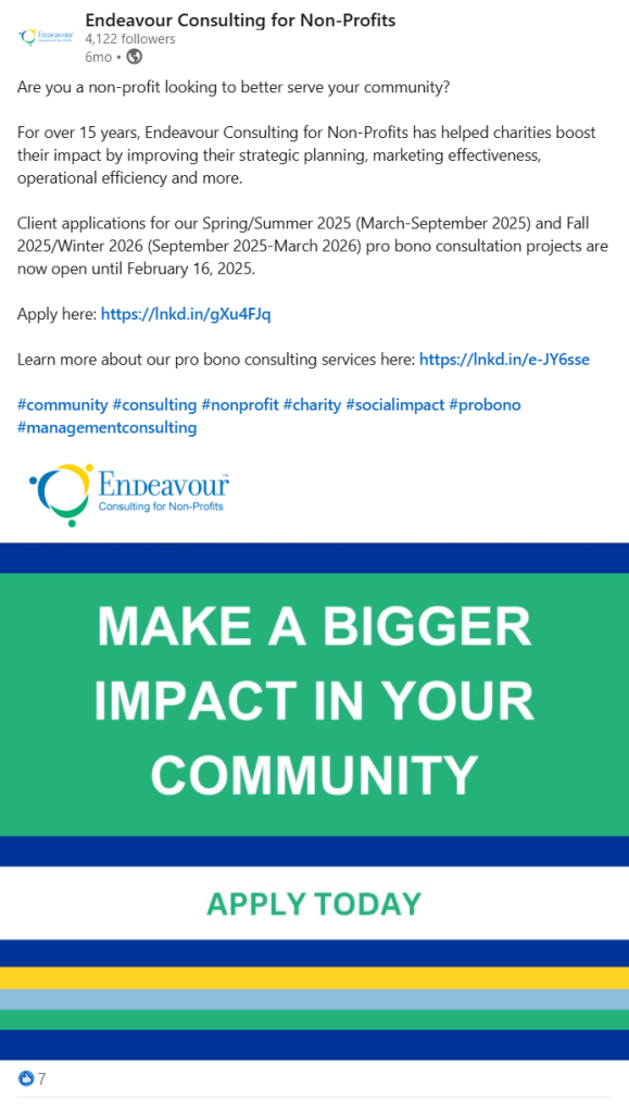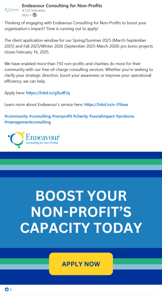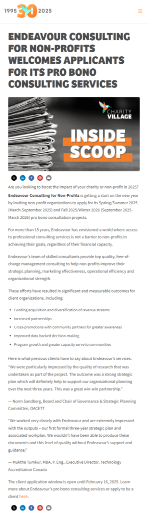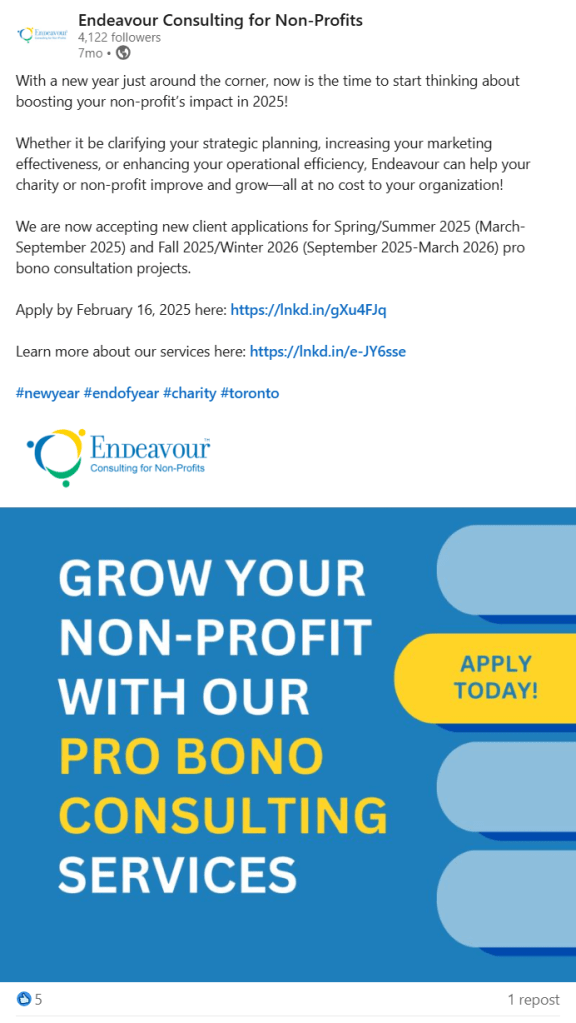 Endeavour Consulting for Non-Profits provides pro bono consulting services for non-profits and charities in the Toronto area.